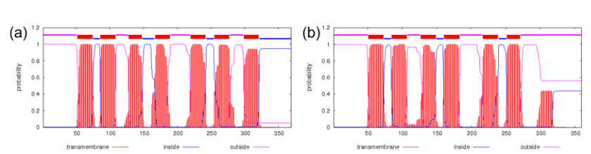 研究人员还使用基于网络的工具TMHMM Server v2.0分析数量变异蛋白序列,以预测疏水跨膜段的存在。服务器基于一个隐马尔可夫模型(HMM),该模型考虑了跨膜螺旋的实际生物结构,同时计算了存在的可能性。