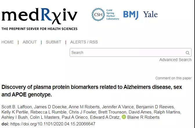 【1】Blaine R. Roberts et al. Discovery of plasma protein biomarkers related to Alzheimer’s disease, sex and APOE genotype. MedRxiv. 15 April, 2020.