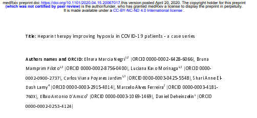 圣保罗利巴内斯医院的肺科医师埃尔娜拉·玛西娅·内格里(Elnara Marcia Negri)在对待一名呼吸困难同时脚趾有循环系统疾病的妇女后,提出了这个想法。内格里的团队为这名妇女提供了一种普通的血液稀释剂肝素,不仅使她的脚趾恢复,而且呼吸也恢复了。内格里想知道,不管患者是否呼吸困难,肝素能否提高患者的低氧水平。4月20日,她在预印本medRxiv上发表的一篇文章,详细介绍了她的医院对27名COVID-19患者的经经历。缺氧患者接受肝素治疗,如果他们的D-二聚体(D-dimer)水平升高,剂量就会增加。D-二聚体水平升高是血凝块过多的标志。