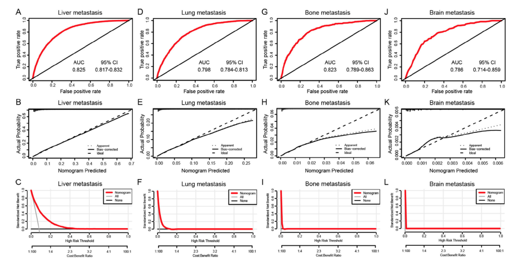 本项研究的目的是制作可以预测CRC患者特定位点远处转移和总体生存的功能性列线图。作者根据已有的公共数据库对CRC病例进行了大规模的回顾性研究。然后制作了可以预测CRC患者特定位点远处转移可能性和总体生存的列线图。用C-index,校正曲线,曲线下面积(AUC),决策曲线(DCA)等指标评估列线图的功能效果。