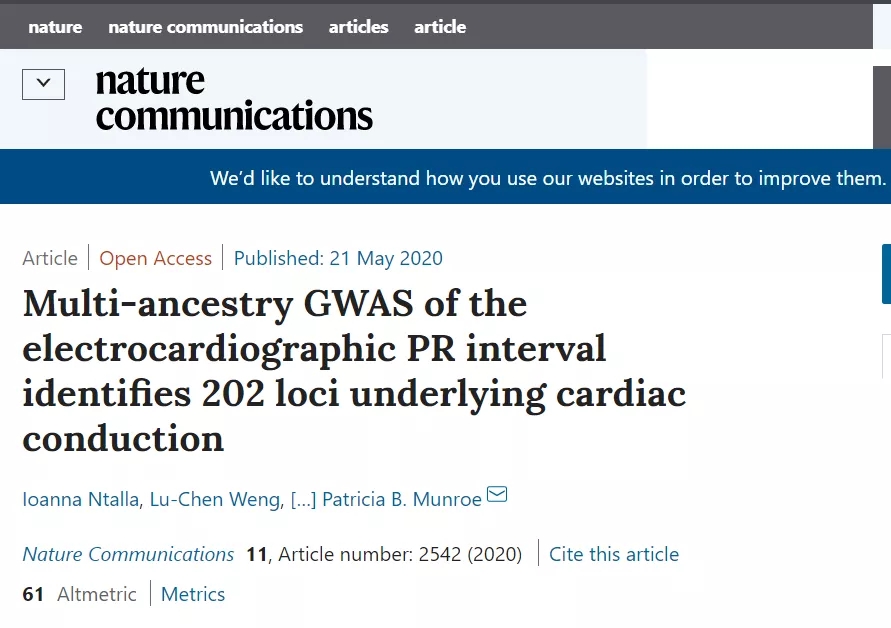 【2】Ntalla, I., Weng, L., Cartwright, J.H.?et al.?Multi-ancestry GWAS of the electrocardiographic PR interval identifies 202 loci underlying cardiac conduction.?Nat Commun?11,?2542 (2020). https://doi.org/10.1038/s41467-020-15706-x
