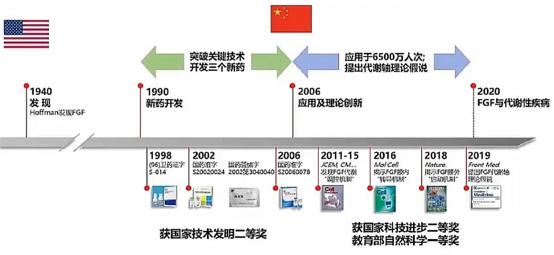 这是李院士团队内容的主要部分。从1940年到1990年,药物的开发上并没有什么进展,因为它对神经、皮肤和细胞有很好的再生作用,所以很多工业界和军方把它制作成治疗创伤的药物。从90年代末,李院士加入到了研究生长因子的行业,开始了40年的FGFs的研究。首先,他们团队把FGFs应用在了再生和修复的药物上,先后是FGF1、FGF2和FGF3三个产品,目前上市已有十多亿的产值。中国研制成功后,也受到很多压力,美国人和其他西方人并不看好,他们认为FGFs可能会导致肿瘤、过度滋生、长斑以及过程中会有一定的风险。所以在应用过程中,需要解决FGFs的临床应用问题。2005年以后,李院士团队重点又回到了动物实验及临床中,他们发明的药物先后获得了国家科技进步二等奖、教育部自然科学一等奖。从2006年开始到现在,FGFs应用于6500万人次,有了50亿的产值,还提出代谢轴理论假说。