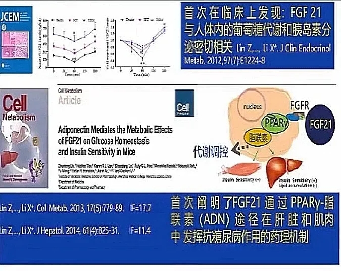 这是FGF在另一方面挖掘到的一个金矿。李院士团队最发现FGF于代谢之间的关系,尤其是在糖尿病里的应用。在进一步的挖掘以后,首次阐明了FGF21在PPARy-脂联素(AND)途径在肝脏和肌肉中发挥糖尿病作用的药理机制。在了解这个机制后,他们就挖掘到了很多其他内容。