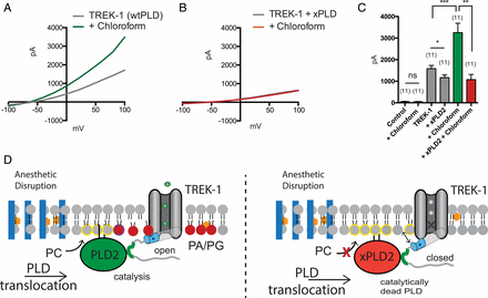 用荧光化学物质标记PLD2,汉森能够通过dSTORM显微镜观察PLD2像一个台球一样从GM1的家移到另一个不太受欢迎的脂质簇PIP2。这激活了PIP2团簇内的关键分子,其中包括TREK1钾离子通道及其脂质激活剂磷脂酸(PA)。汉森说,TREK1的激活基本上冻结了神经元的激活能力,从而导致意识丧失。TREK1钾离子通道释放钾离子,这会使神经产生超极化,更难发射,只能关闭。”。