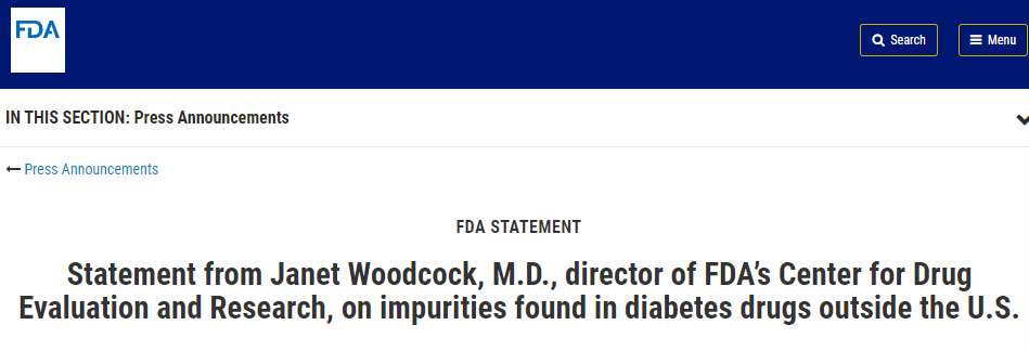 在过去的两年半中,FDA已发现包括血管紧张素II受体阻滞剂和雷尼替丁(Zantac)在内的几种药物含有被称为亚硝胺的少量遗传毒性物质,例如N-亚硝基二甲胺(NDMA)。早在2019年12月9日,FDA就开始调查二甲双胍治疗糖尿病中可能致癌的化学物质的含量。FDA还将与公司合作测试在美国销售的二甲双胍样品,如果发现高含量的NDMA,将酌情建议召回。