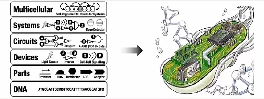 合成生物学就可以用一些计算机的语言、计算机或电子工程的思维,把DNA做成元件,把这些基因做成回路,再对生命体进行精准的控制,然后通过设计构建测试分析学习这样一个反复循环的过程来实现目的。