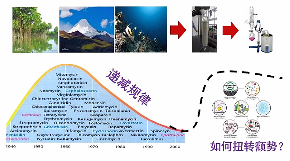 天然产物发展的过程:上世纪40年代,从青霉素的诞生开始进入高潮。上世纪六七十年代,大量的天然产物被发现。目前用的临床天然产物抗生素几乎都是在那个时候做出来的,只不过现在对这个产物的骨架进行了各式各样的修饰。但随着时间的延续,发现新的产物的速率逐年在降低,几乎没有新的抗生素在临床上出现。上一代最后一个抗生素是康舒达托霉素,大约是30多年前发现的,20多年前就进入临床。现在已经没有新的武器诞生了。