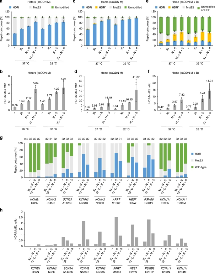 5个基因座(KCNH2 N588D/N588K, APRT M136T, HES7 R25W and PSMB8 G201V)上,在XL+N+S处理下32个克隆中获得18-23个具有HDR等位基因(56%-72% 总HDR效率)。与N+S联用时,XL413引起的细胞周期停滞对HDR率的影响强于冷休克处理。其他5个基因座(KCNE1?D85N,?KCNH2?N45D,?SCN5A?A1428S, and?KCNJ11?T293N/T294M)的编辑效率低由于gRNA活性低。