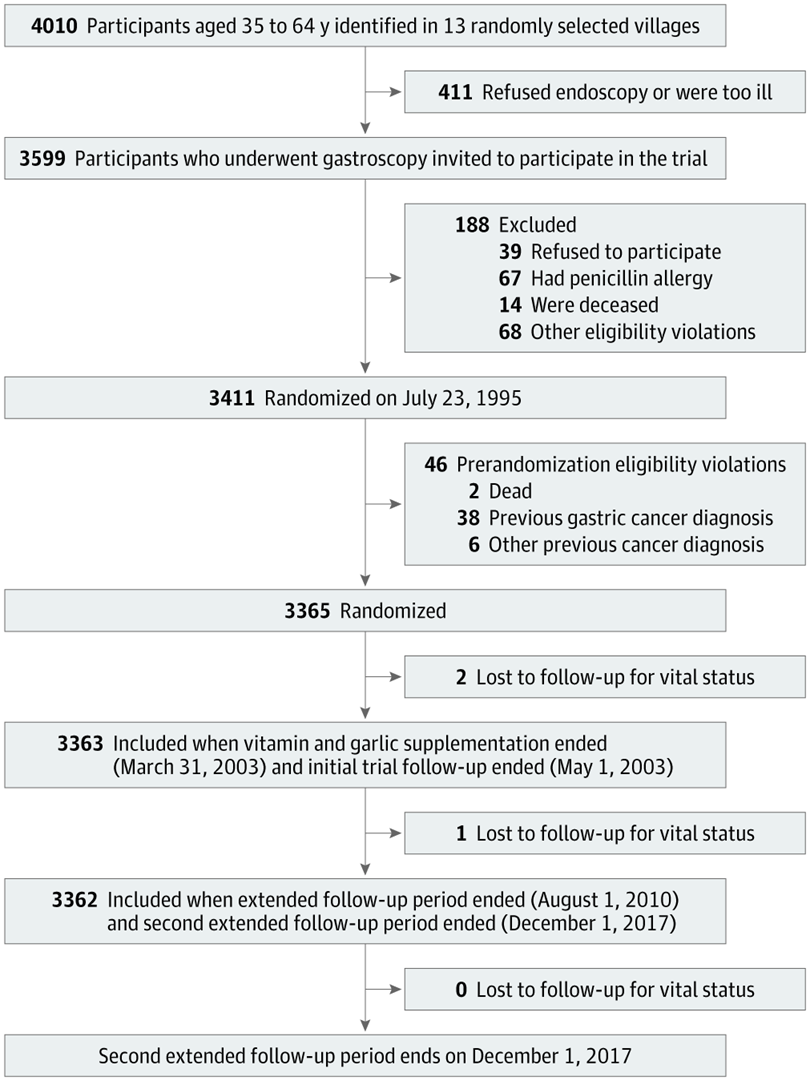 1995年,研究人员在临朐县启动了山东干预实验(SIT),用来评估2周的幽门螺杆菌治疗和7.3年的维生素和大蒜补充剂对胃癌的进展。期间共随访22.3年,研究人员发现胃癌风险的显著降低与补充维生素和大蒜补充剂有关。
