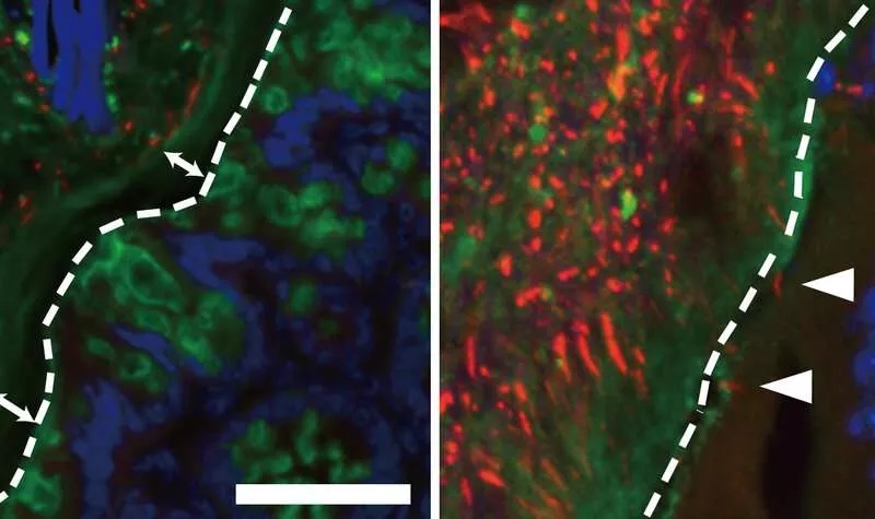 同种异体移植后,在正常小鼠中看到的内部粘液层(左,箭头)明显变薄(右)。还观察到细菌侵入肠组织(红色)(右箭头)。虚线表示内部粘液层和上皮细胞之间的边界。