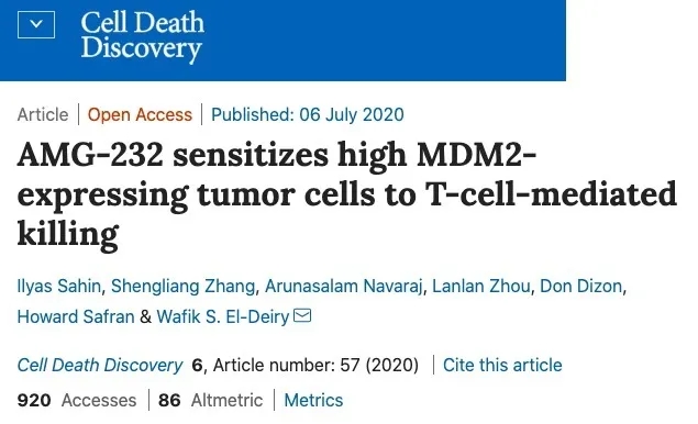 这项研究由布朗大学肿瘤学系副院长,病理学和实验医学教授Wafik El-Deiry博士领导,并在线发表在《Nature》子刊《Cell Death Discovery》上。题目为“AMG-232 sensitizes high MDM2-expressing tumor cells to T-cell-mediated killing”
