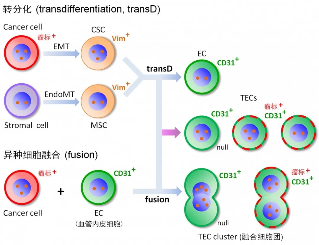 肿瘤脉管系统的内膜主要由异倍体“肿瘤内皮细胞 (Tumor-derived Endothelial Cell, TEC)” 构成,它们可由肿瘤细胞直接转化而来。TEC, 顾名思义,其本质是一类表达了内皮标志物 CD31 的特殊肿瘤细胞,这些细胞脱落入血后形成了循环肿瘤内皮细胞CTEC。TEC可通过“内皮细胞肿瘤化” (cancerization) 及“肿瘤细胞内皮化” (endothelialization) 这两种途径产生,其中,肿瘤细胞内皮化可分为 “转分化”和起主要作用的“细胞融合”两种形式。
