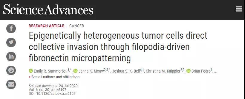 该研究由埃默里大学的血液学和肿瘤医学教授Adam Marcus领导,并于2020年7月24日发表在《科学进展》上,题目为“Epigenetically heterogeneous tumor cells direct collective invasion through filopodia-driven fibronectin micropatterning”