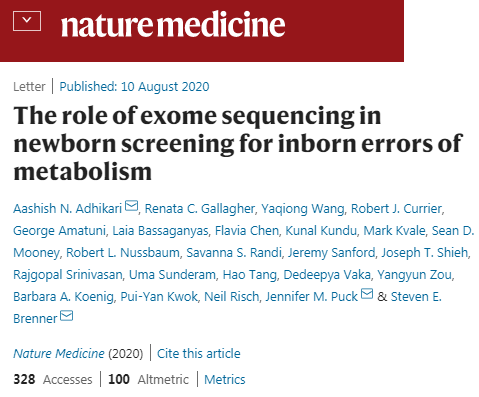 【1】Adhikari, A.N., Gallagher, R.C., Wang, Y. et al. The role of exome sequencing in newborn screening for inborn errors of metabolism. Nat Med (2020). https://doi.org/10.1038/s41591-020-0966-5