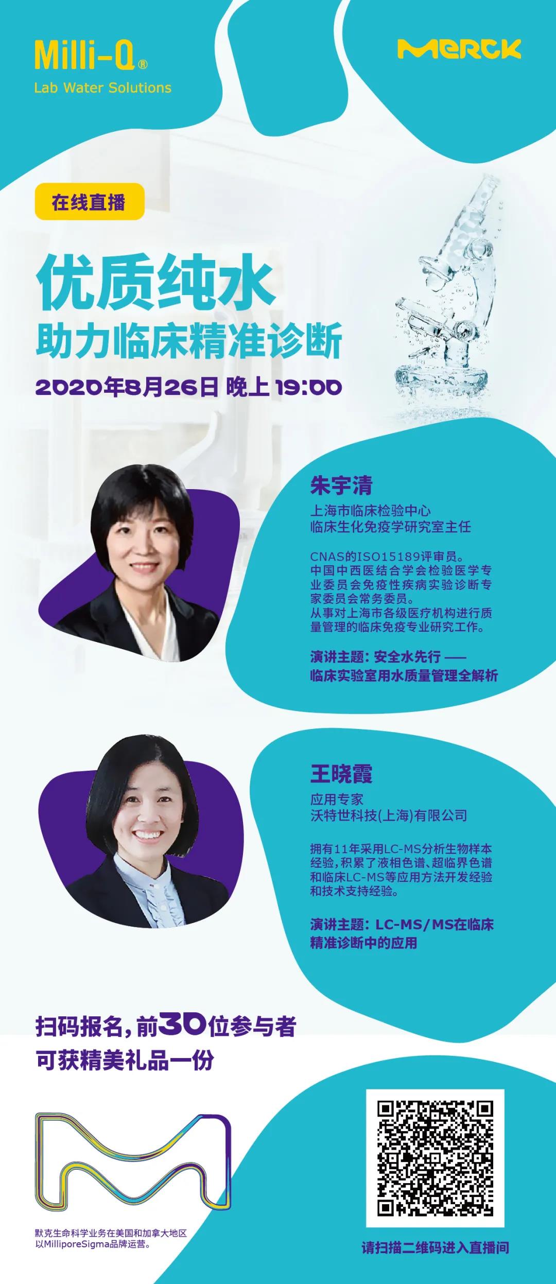 为了帮助临床实验室工作人员更好地理解实验室纯水应用,默克Milli-Q®与转化医学网合作,特邀上海市临床检验中心朱宇清主任和沃特世科技(上海)有限公司应用专家王晓霞,一起解读临床实验室纯水相关的法规标准,为您在临床实验室纯水应用中的问题答疑解惑。