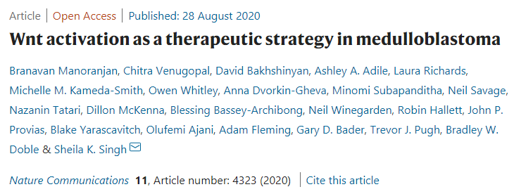 麦克马斯特大学希拉·辛格(Sheila Singh)博士实验室发表了一项研究,该研究发现了一种小分子化合物,可以激活成神经管细胞瘤非Wnt亚型中的Wnt通路,使这些恶性肿瘤对治疗更敏感。这项工作还发现了Wnt通路,它在历史上被认为是促进癌症的,在某些情况下起着癌症抑制剂的作用。该研究在8月28日发表在《自然通讯》杂志上,题为“Wnt activation as a therapeutic strategy in medulloblastoma”。