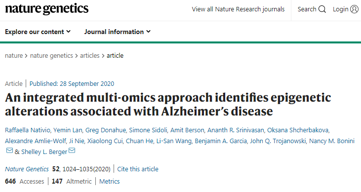 该研究由宾夕法尼亚大学的Shelley Berger博士以及Nancy Bonini博士共同领导,并于9月28日发表在《自然遗传学》杂志,题为“An integrated multi-omics approach identifies epigenetic alterations associated with Alzheimer’s disease”。