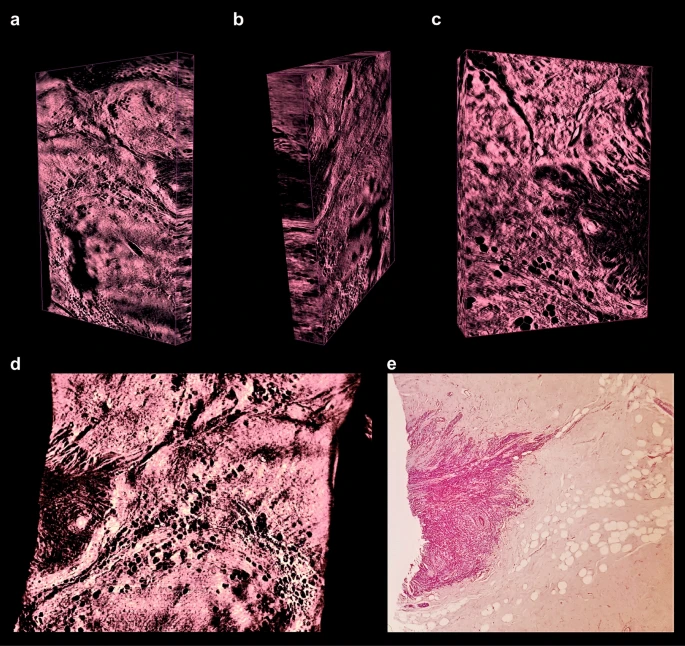 清除后,对肿瘤切除部位成像。图像经过计算处理后以增强对比度和去除伪影,然后进行3D重建。