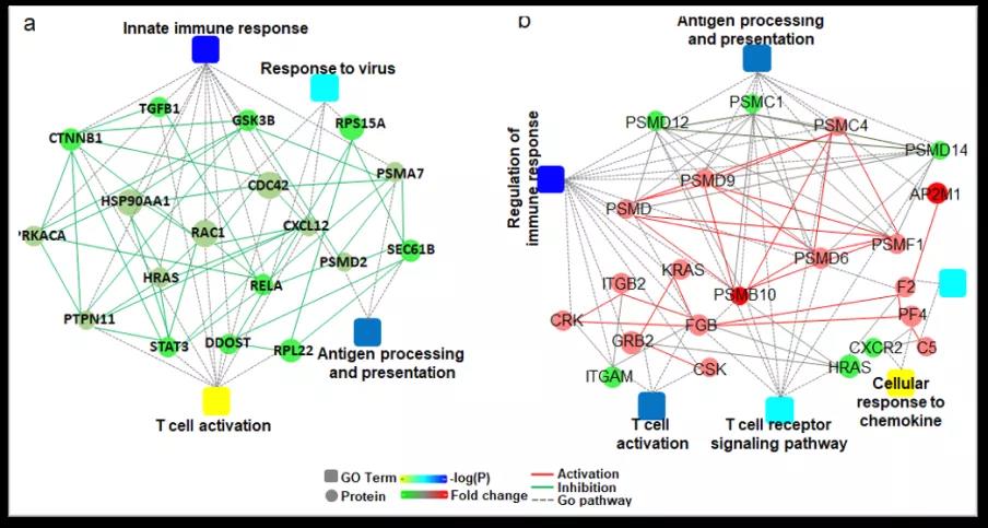 图3. 轻中症患者呈现免疫应答抑制(a)和重症患者呈现免疫应答上调(b)