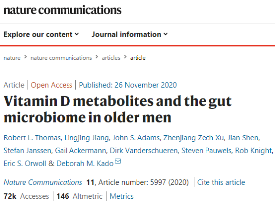 这项新研究由加利福尼亚大学圣地亚哥分校的研究人员进行,并于近日发表在《Nature Communications 》上,题为“Vitamin D metabolites and the gut microbiome in older men”。