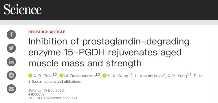 该研究于12月10日发表在《Science》杂志,题为“Inhibition of prostaglandin-degrading enzyme 15-PGDH rejuvenates aged muscle mass and strength”。