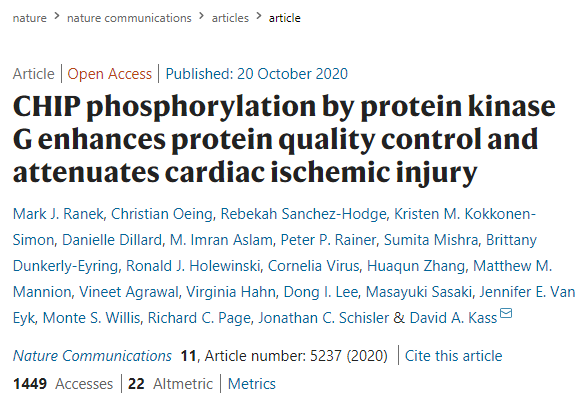 最近,在一项新研究中,约翰霍普金斯大学医学院的研究人员在《Nature Communications》上发表了一篇题为“CHIP phosphorylation by protein kinase G enhances protein quality control and attenuates cardiac ischemic injury”的论文,该论文展示了一种酶如何清除受损和错误折叠的蛋白质(这些蛋白质积聚在心脏细胞中最终变得有毒),从而更好地帮助患者从心脏病发作中康复。