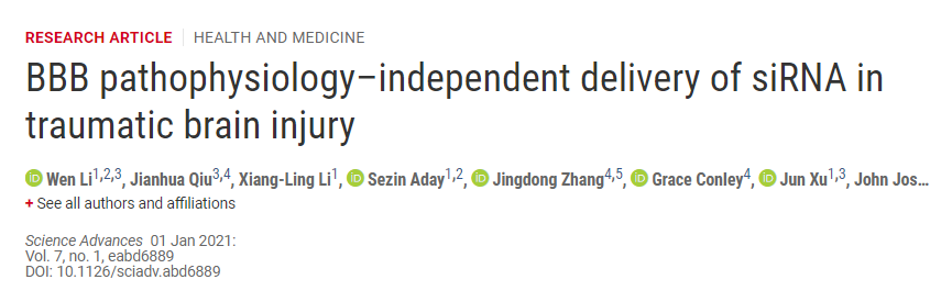 最近布莱根妇女医院与波士顿儿童医院的研究人员在《Science Advances》上发表了题目为“BBB pathophysiology–independent delivery of siRNA in traumatic brain injury”的论文,就解决了治疗剂通过血脑屏障(BBB)进入大脑时面临的挑战,促进了治疗药物成功输送到大脑!