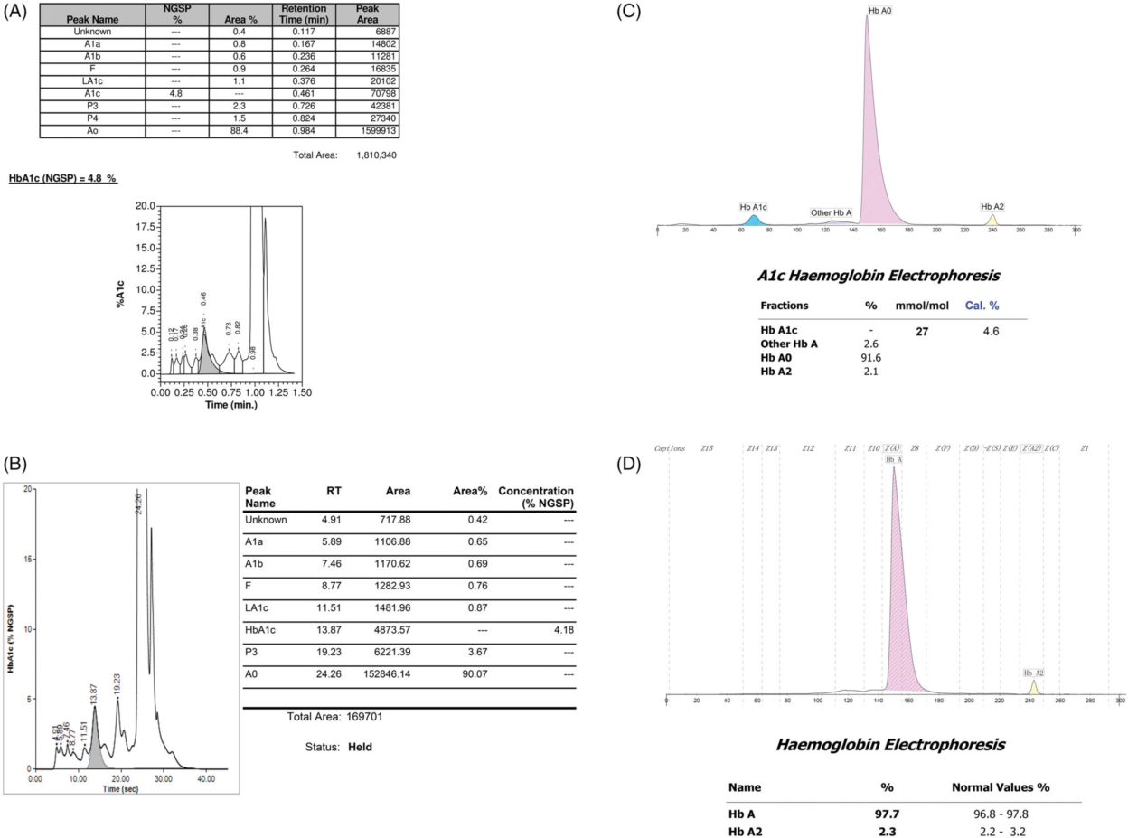 通过Variant II Turbo 2.0(A),HPLC系统(B),和CE系统(HbA1c程序)(C)检测糖化血红蛋白。血红蛋白分析是通过CE系统的Hb程序(D)。