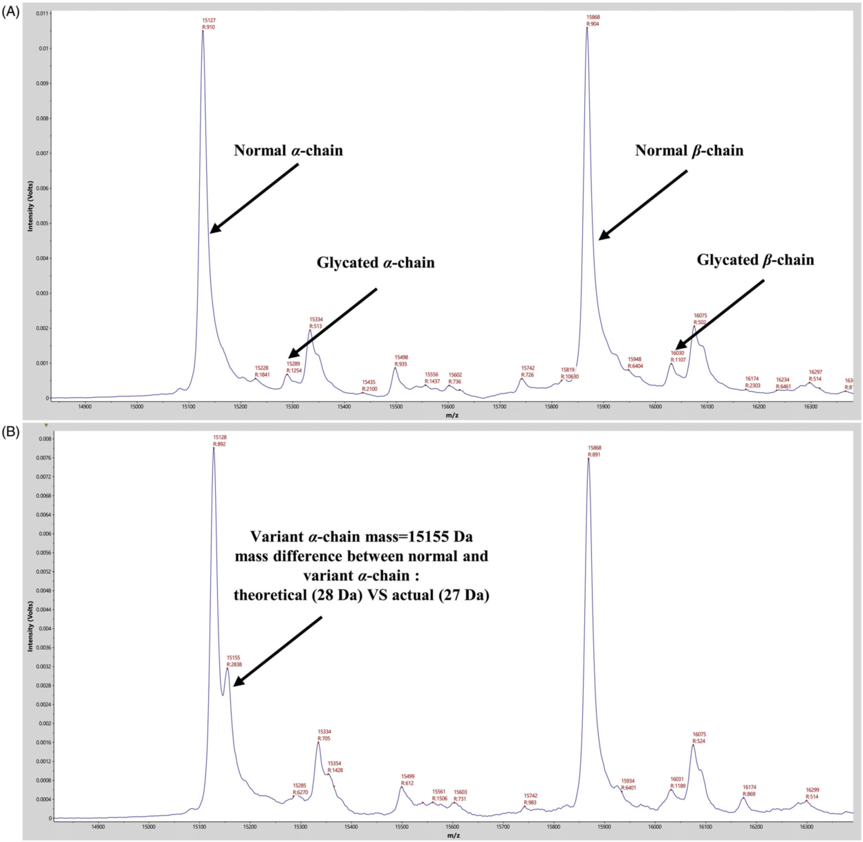 (A)非变异样品的质谱图显示α-链(15127 Da)、β-链(15868 Da)以及相应的糖基化α-链(15289 Da)和糖基化β-链(16030 Da)