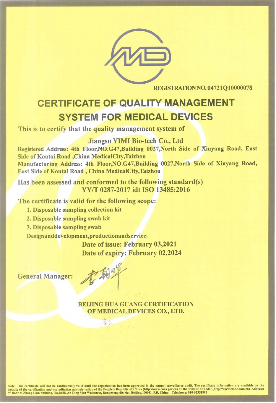 本次认证范围涵盖一次性使用采样器、一次性使用病毒采样管、一次性使用取样器的设计开发、生产和服务。这标志着江苏一米生物科技有限公司立足于长远发展,完成好实际目标,已步入规范化、标准化、科学化的企业管理轨道。质量管理体系的建立和运行,也将让江苏一米生物科技有限公司在市场竞争中树立良好的企业形象和信誉。