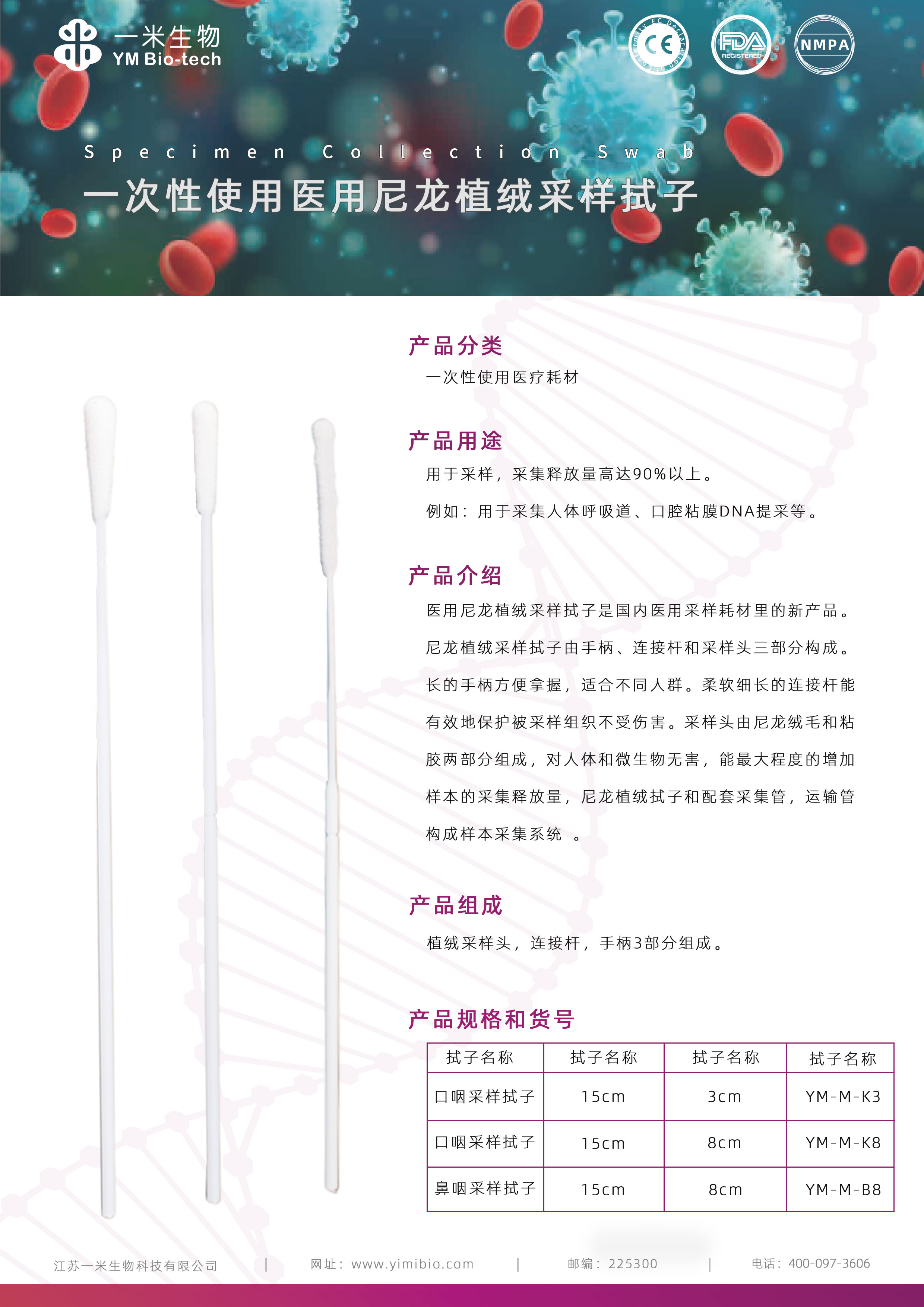 【导读】江苏一米生物科技有限公司是一家专注于提供生物样本采集及储存技术整体解决方案的高新科技企业,作为上海领因生物的全资子公司,现今已开发出了众多的新型样本采集工具、配套DNA/RNA样本保存试剂和提取试剂盒。主要的产品类型包括:新型冠状病毒采样套装、新型冠状病毒唾液采集保存器、唾液DNA采集保存器、尿液RNA采集保存器、粪便肠道微生物DNA采集保存器、鼻咽拭子套装、一体式采样拭子套装、一次性采样拭子套装。
