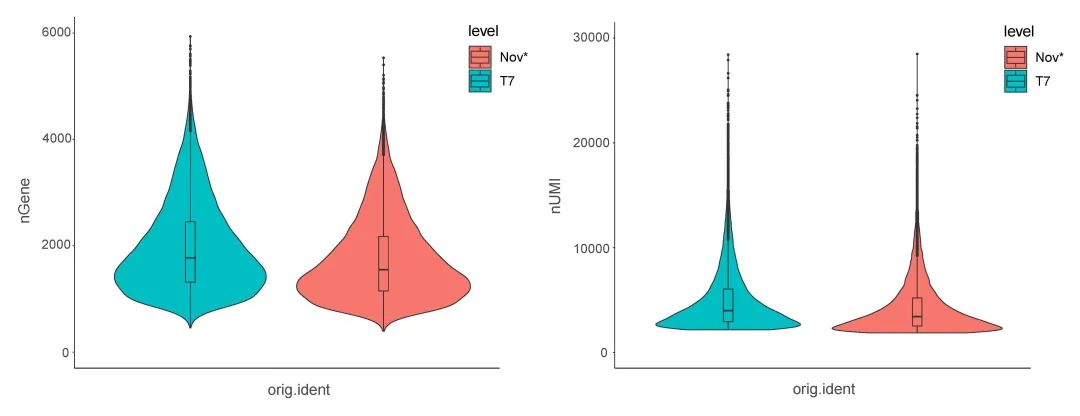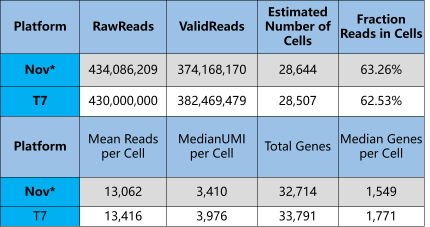 从 Cell calling 数据上看, T7 平台 和Nov*平台的预估总细胞数基本一致(表 1),检测所得基因中位数基本一致(表1),在 nUMI 及 nGene 的指标方面两个平台结果可比(图 1)。