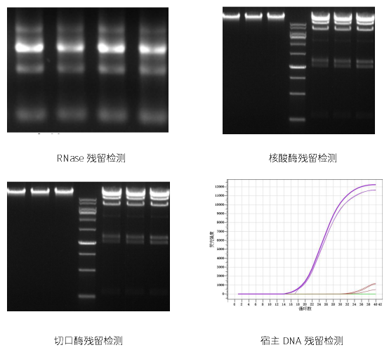 分别检测Rnase、核酸酶、切口酶、大肠杆菌DNA残留,经检测结果显示,成品无相关酶的残留,且表达的宿主DNA残留也达到了使用要求标准。