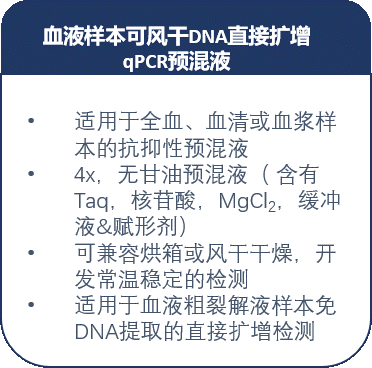 此次新推出的产品,就是专门针对血液样本的可风干DNA直接扩增qPCR预混液(MDX092), 无需进行核酸提取即可直接从全血样本中进行DNA定量的qPCR检测。