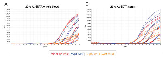 A)20% K2-EDTA全血,或 B)20%的血清,加入连续10倍稀释的质粒DNA (分别为10000、1000、100和10个拷贝),分别使用可风干预混液MDX092的湿液 (蓝色)、风干液(红色)与供应商R(橙色)进行多重qPCR检测恶性疟原虫。 结果显示,干燥后的可风干预混液MDX092与湿液相比, 对血液样本保持同样的扩增效率和灵敏度,并且比供应商R的预混液具有更高的荧光强度和灵敏度。