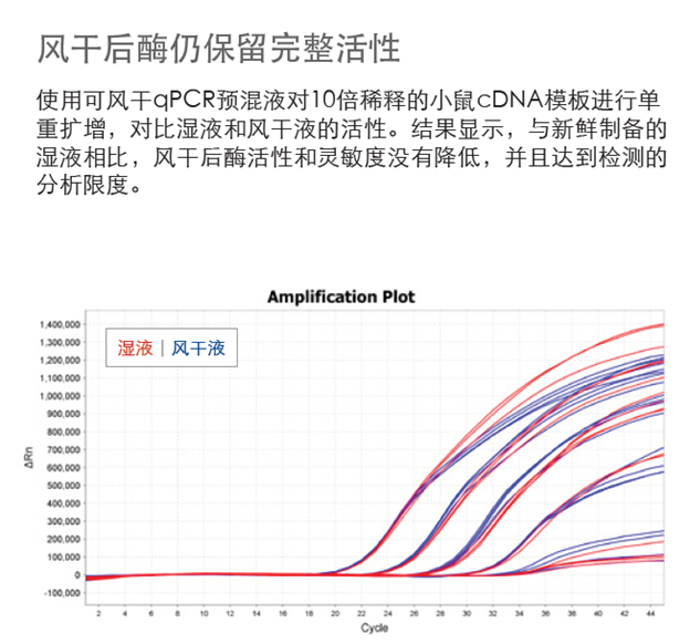 在经过对可风干的qPCR/RT-qPCR预混液的湿液和干燥后的复溶液进行性能对比后,结果显示干燥后复溶的预混液依然能够保证同样的扩增高效性。