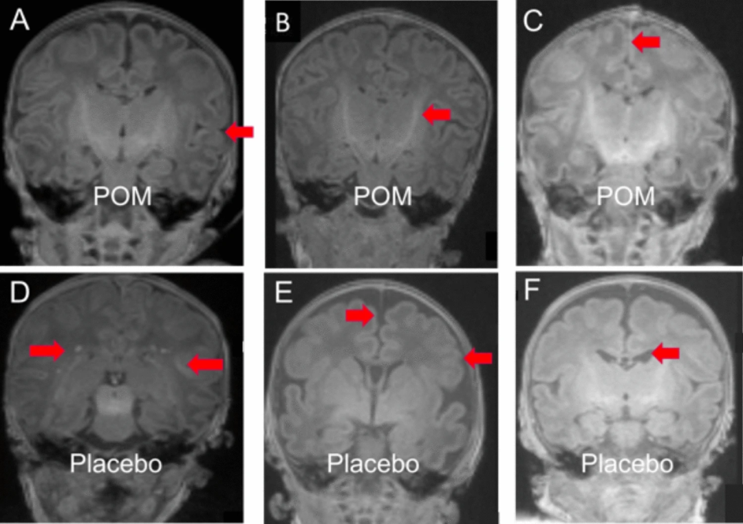 图 母亲食用石榴汁的胎儿(上排)和母亲食用安慰剂的胎儿(下排)的脑部MRI
