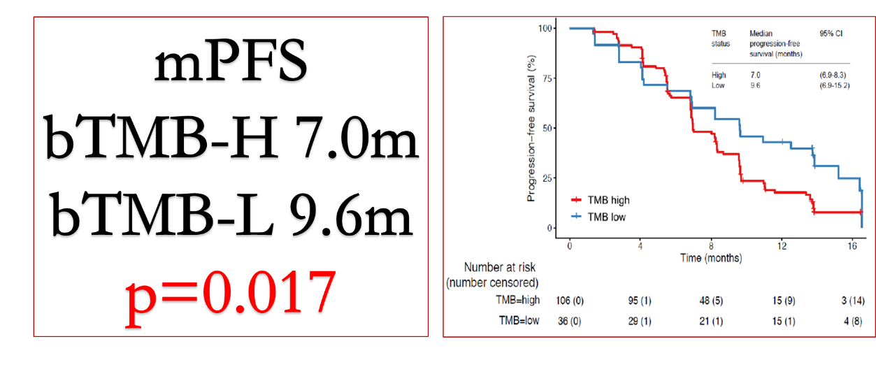 基线时,高bTMB(≥2.23,n=106)患者的PFS明显短于低bTMB(<2.23,n=36;7.0 vs 9.6个月,HR 1.72, 95% CI 1.10-2.71, p=0.017)