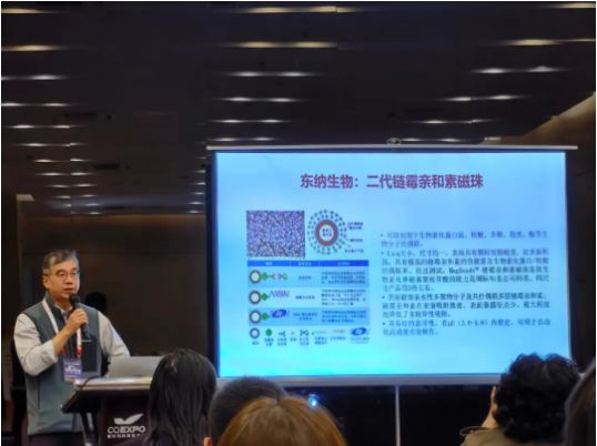 东纳生物总经理王建国带来了“磁珠上的实验室”磁珠新品发布会,他介绍了东纳生物1μm及4.5μm羧基磁珠、氨基磁珠、核酸提取硅羟基磁珠、PCR产物纯化磁珠及蛋白纯化磁珠等明星产品的特性及其应用,东纳生物磁珠良好的稳定性、单分散性、较高的表面基团修饰和载量、不同尺寸以及快速的磁响应性引起了与会人员的极大兴趣。