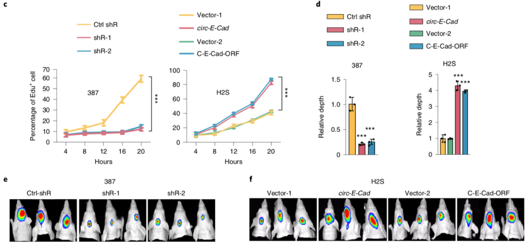 作者分别在GSCH2S中构建circ-E-Cad过表达细胞系,在GSC387和GSC4121中构建circ-E-Cad敲减细胞系。通过细胞学实验证实circ-E-Cad与肿瘤细胞的干性相关,提示其参与调控了肿瘤的发生。