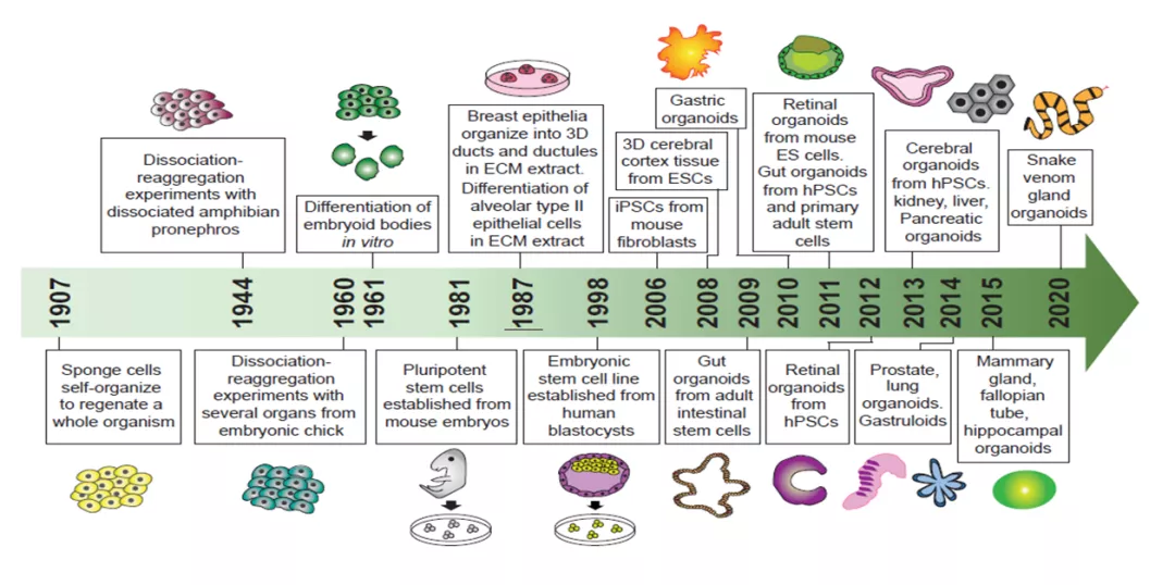 早在1907年,Henry Van Peters Wilson第一次进行体外再生有机体的尝试,证明了分离的海绵细胞可以自我组织再生一个完整的有机体。几十年后,几个研究小组进行了分离-再生实验,从分离的两栖动物前肾和鸡胚中生成不同类型的器官。不过自从1981年从小鼠胚胎中分离和建立多能干细胞(PSCs)时,干细胞研究才开始蓬勃发展。但直到1998年,科学家才首次从人类囊胚中分离和培养出胚胎干细胞。随后,通过对小鼠和人成纤维细胞进行重编程,建立了多能干细胞,其对干细胞和类器官研究产生了重大影响。2009年,类器官技术有了突破性进展,Hans Clevers团队成功地在体外培养出具有自我更新能力,保持肠道腺窝绒毛状结构的小鼠肠道类器官,自此类器官培养拉开了序幕并且热度只增不减。经过近10年的快速发展,科学家们已经能在实验室利用细胞培育、分化、自组装成各种类似人体组织的3D结构,制造出视网膜、肝脏、肾脏、前列腺、肺、乳腺甚至是脑等在内的各种类器官。