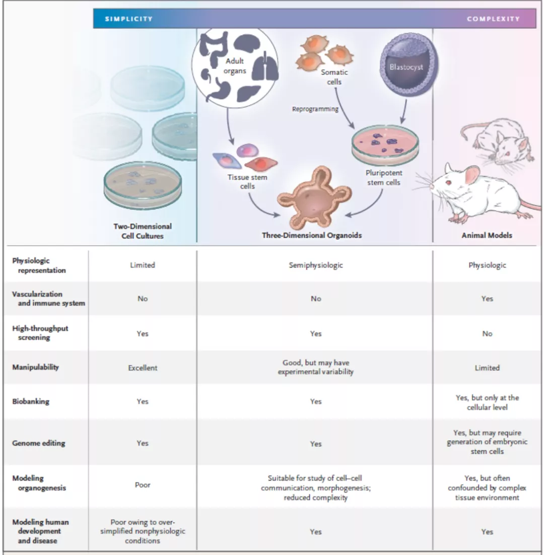 图4.类器官和2D细胞培养、动物模型对比