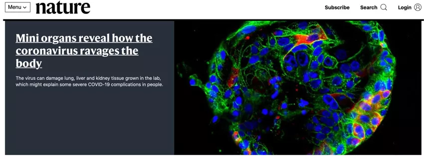 图6. 人源类器官研究新冠病毒感染和损伤肝脏机制成果获《自然》新闻报道和首页图片高亮
