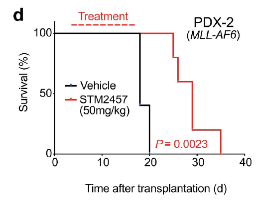 接着,研究人员又将来自AML患者的细胞移植到免疫功能低下的小鼠中,模拟这种疾病(小鼠模型)(图)。当他们用STM2457处理小鼠时,发现这能阻碍移植细胞的增殖和扩展,减少了小鼠骨髓和脾脏中白血病细胞的数量,并显著延长了小鼠的寿命,且这种药物还没有毒性副作用。