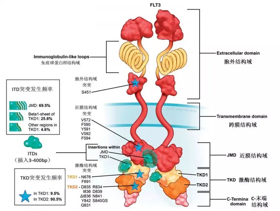 FMS样酪氨酸激酶3(FLT3)基因位于染色体13q12.2,其编码的FLT3蛋白属于III型受体酪氨酸激酶(RTK)家族,可以调节细胞凋亡、增殖及造血干/祖细胞的分化,在造血过程中发挥重要作用。