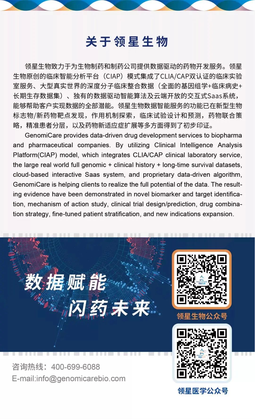 | 导读 | 2021年5月20日,领星生物科技(上海)有限公司与格物致和生物科技(北京)有限公司签署战略合作协议,结成紧密的战略伙伴关系。将在肿瘤药物伴随诊断研发领域进行深入合作,携手推动更多创新药物研发进程,惠及中国本土及全球患者。 |