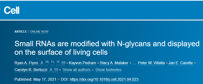 2021年5月17日,斯坦福大学Ryan Flynn和Carolyn Bertozzi正式将研究结果发表在《Cell》,题为“Small RNAs are modified with N-glycans and displayed on the surface of living cells”。