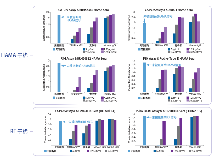 三个不同的双鼠单克隆三明治化验(商业CA19-9, 商业FSH 和内部RF实验)被用来比较TRU Block™ ULTRA, 小鼠IgG 和另一个竞争对手的主动HAMA阻断剂的性能。 为了量化每个人血清中HAMA或RF活性的相对含量,实验中使用了不含小鼠IgG 和其他阻断剂的稀释缓冲液,按照制造商的使用说明进行实验。 含有TRU Block™ ULTRA ,小鼠IgG或者竞争阻断剂的阻断液使用同样的稀释缓冲液各制备了四个不同浓度 (5 μg/ml, 2.5 μg/ml ,1.25 μg/ml 和0.625 μg/ml).