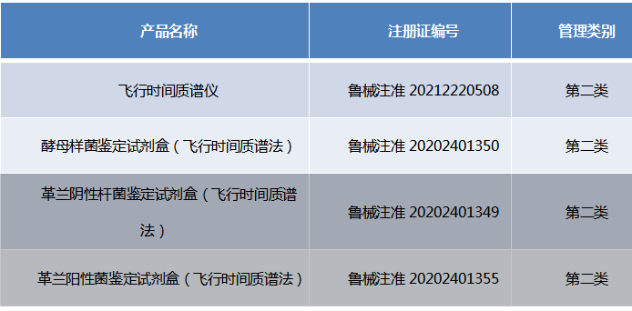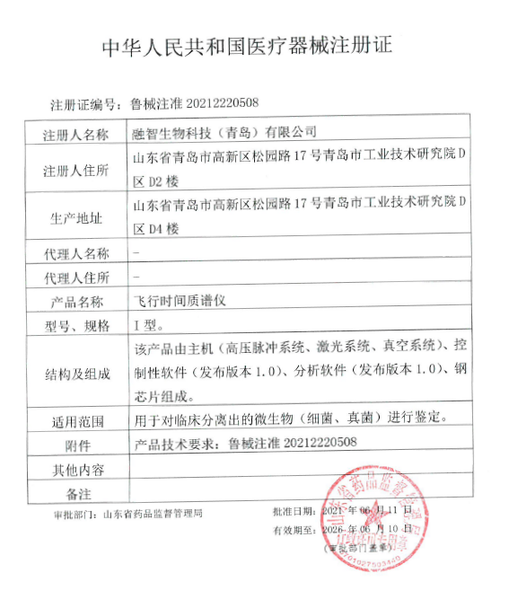 | 导读 | 由融智生物自主开发的飞行时间质谱仪以及配套的微生物鉴定试剂盒等4款产品,分别获得山东省药品监督管理局颁发的医疗器械注册证(Ⅱ类)。 |