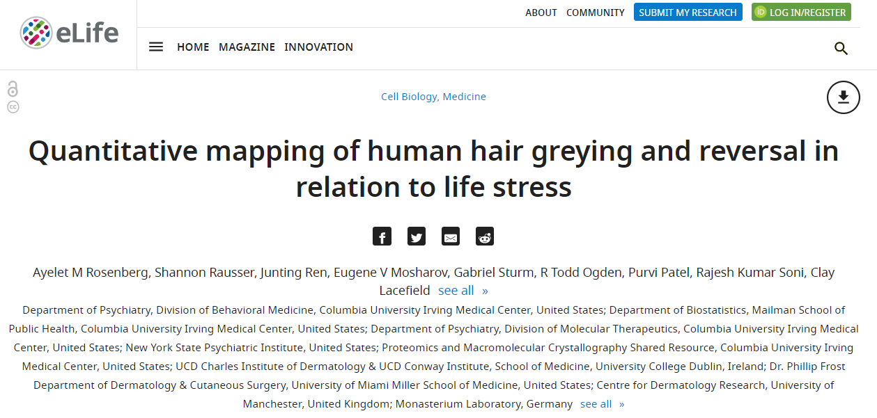 我们一般认为,已经从毛囊中生长出来的头发不会改变颜色,但哥伦比亚大学的研究人员首次提供了定量证据,将心理压力与人们的头发变白联系起来,结果发表在《eLife》上,题为“Quantitative mapping of human hair greying and reversal in relation to life stress”。他们表示:人类头发在压力下会加速变白,当压力消除后,头发又会恢复到自然颜色,这一发现证实压力对头发颜色有影响的古老猜测。